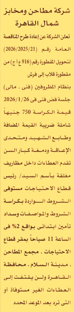 HOT information مناقصة عامة رقم 21/2025/2026 لعملية تحويل المقطورة رقم “916 ع أ ج” من مقطورة قلاب إلى فرش عن جريدة الأهرام Post navigation الجمعية التعاونية للبناء والإسكان لأعضاء نقابة المهن الزراعية وأسرهم بسوهاج الشركة المصرية لإدارة وتشغيل المترو