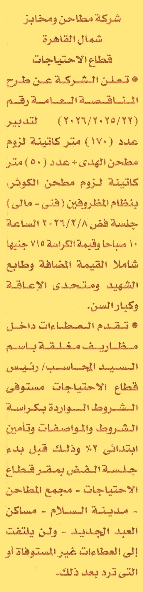 HOT information مناقصة عامة رقم 22/2025/2026 لعملية توريد عدد 170م كاتينة لزوم مطحن الهدى وعدد 50م كاتينة لزوم مطحن الكوثر عن جريدة الأخبار Post navigation مركز مارينا العلمين السياحي إحدى الشركات الكبرى