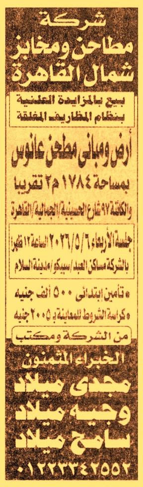 HOT Information مزايدة علنية لعملية بيع أرض مطحن عانوس بمساحة 1784م2 تقريبا والكائنة 97 ش الحسينية – الجمالية – القاهرة (تسهيلات في السداد لمدة عامين) عن جريدة الجمهورية Post navigation شركة مياه الشرب والصرف الصحي بدمياط شركة الغازات البترولية