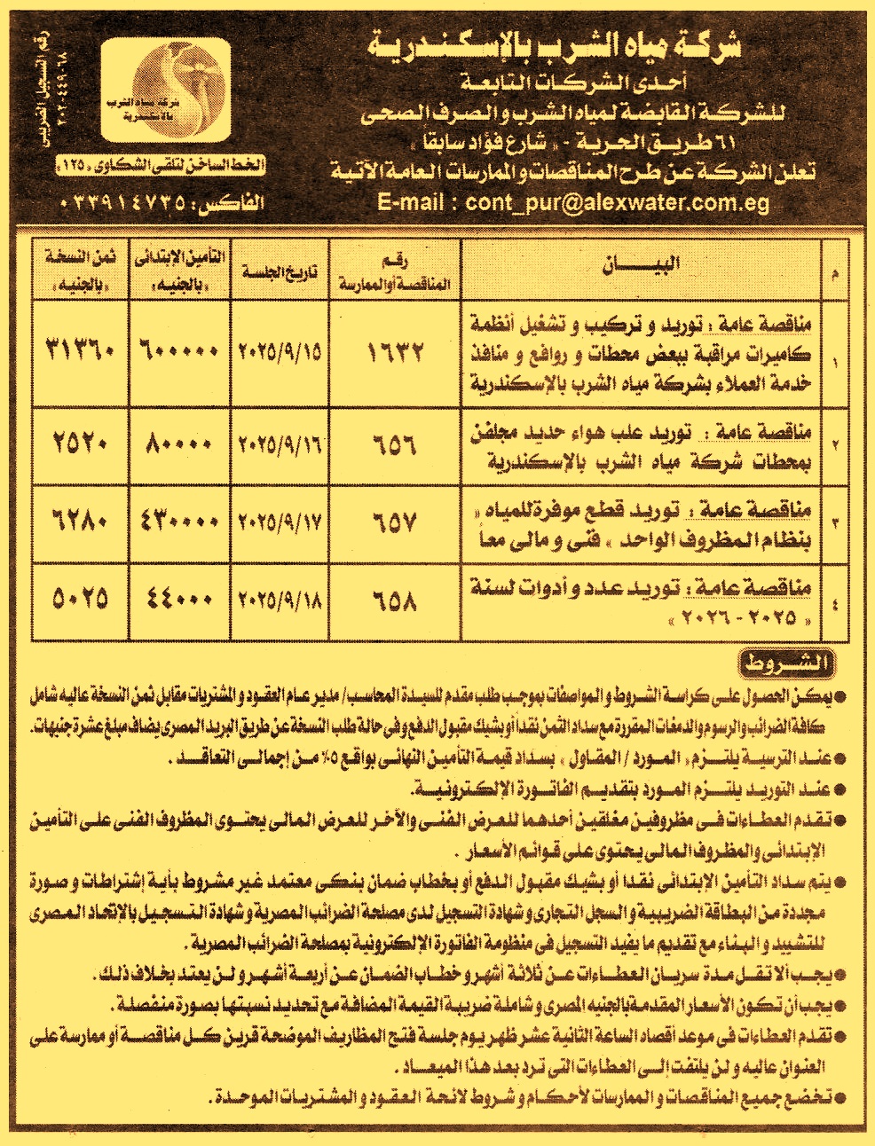 (مدة سريان خطاب الضمان 4 أشهر ومدة سريان العطاء 3 أشهر ويجب أن تكون الأسعار شاملة ضريبة القيمة المضافة مع تحديد نسبتها بصورة منفصلة ويرفق مع المستندات شهادة القيد بالاتحاد المصري للتشييد والبناء)