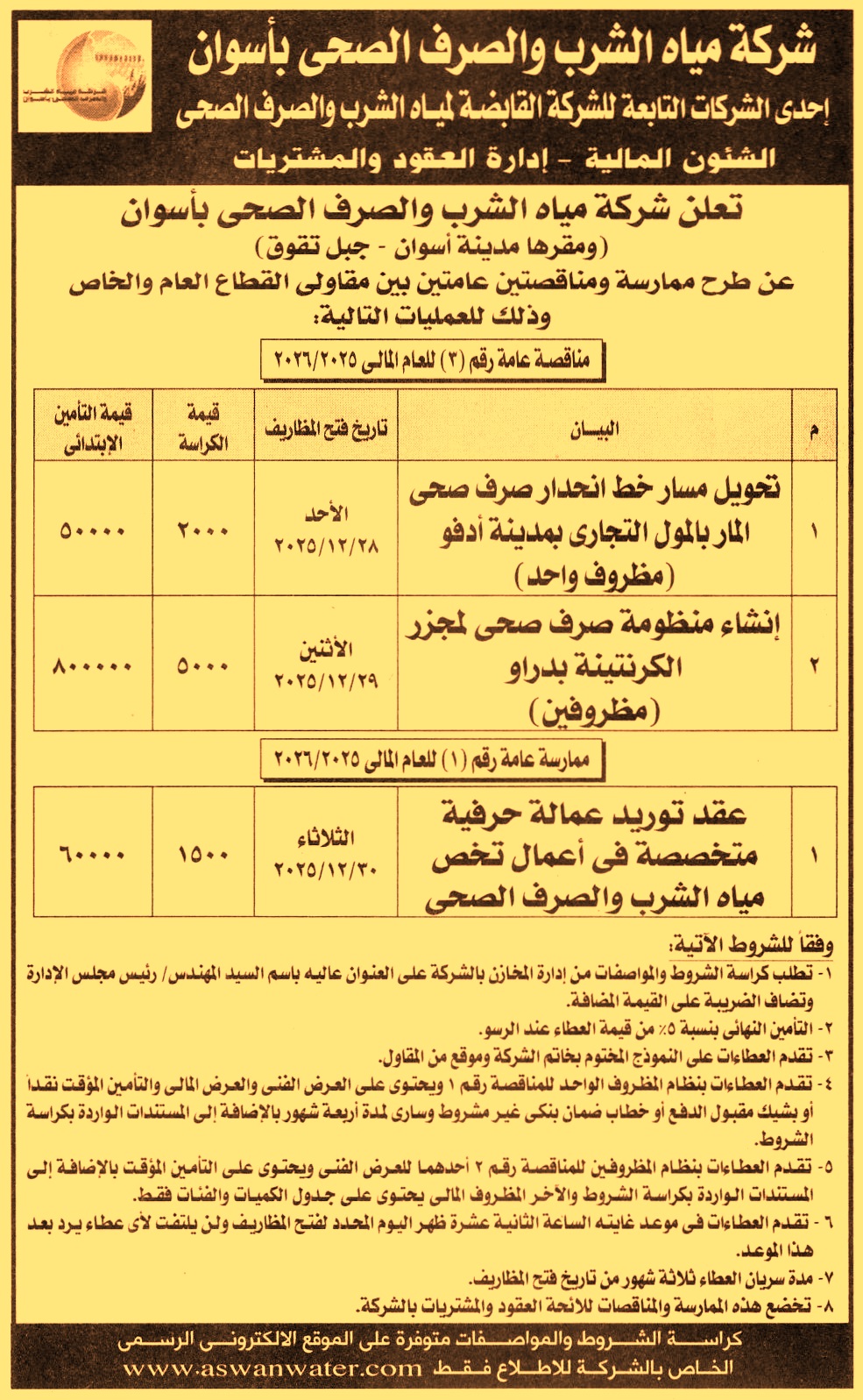 HOT Information مناقصة عامة لعملية تحويل مسار خط انحدار صرف صحي المار بالمول التجاري بمدينة ادفو (مدة سريان خطاب الضمان 4 أشهر ومدة سريان العطاءات 3 أشهر) عن جريدة الأخبار Post navigation شركة مياه الشرب والصرف الصحي بالدقهلية محافظة الدقهلية