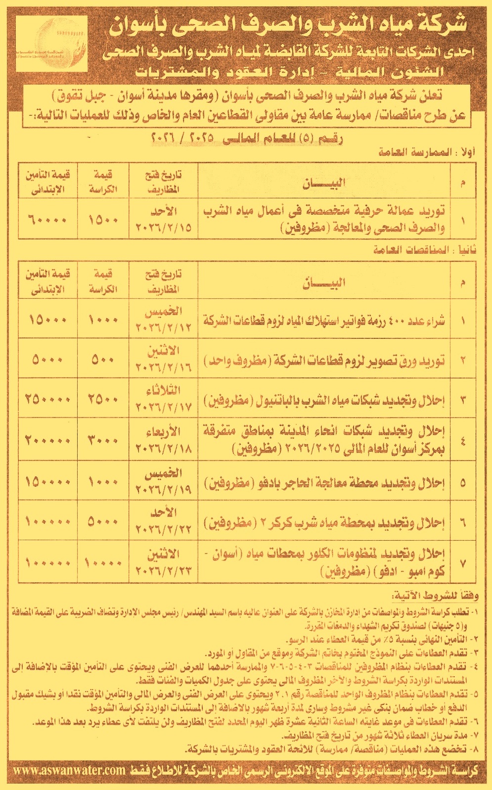 HOT Information ممارسة عامة لعملية توريد عمالة حرفية متخصصة في أعمال مياه الشرب والصرف الصحي والمعالجة (مدة سريان العطاءات 3 أشهر) عن جريدة الأخبار Post navigation مديرية الشئون الصحية بالقاهرة الوحدة المحلية لمركز ومدينة الرياض