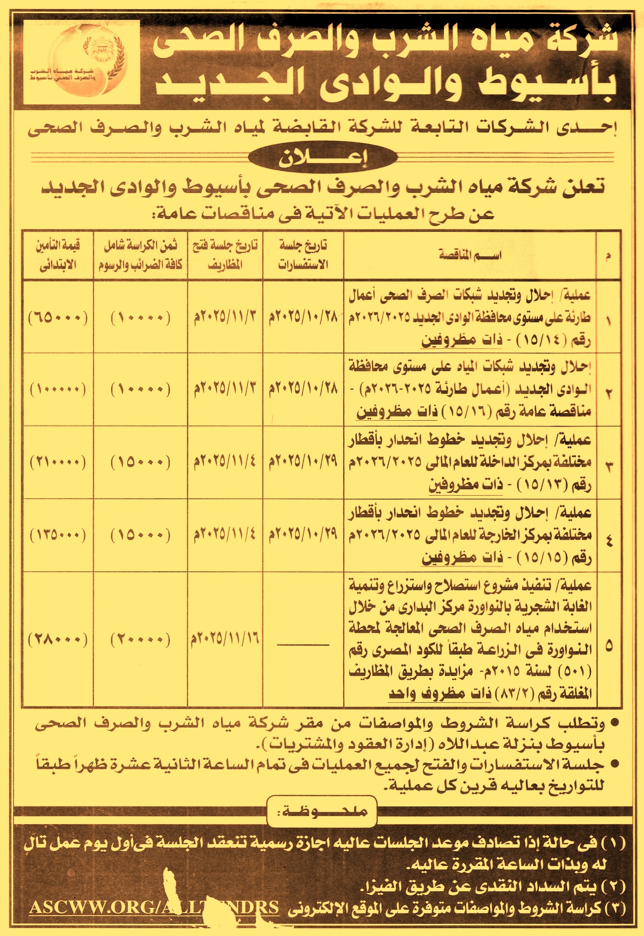 HOT information مناقصة عامة رقم 14/15 لعملية إحلال وتجديد شبكات الصرف الصحي أعمال طارئة على مستوى محافظة الوادي الجديد 2025/2026 (جلسة الاستفسارات يوم 28/10/2025) عن جريدة الأخبار Post navigation شركة إم أو تي للاستثمار والتنمية مركز التنمية الشبابية بمدينة بنها