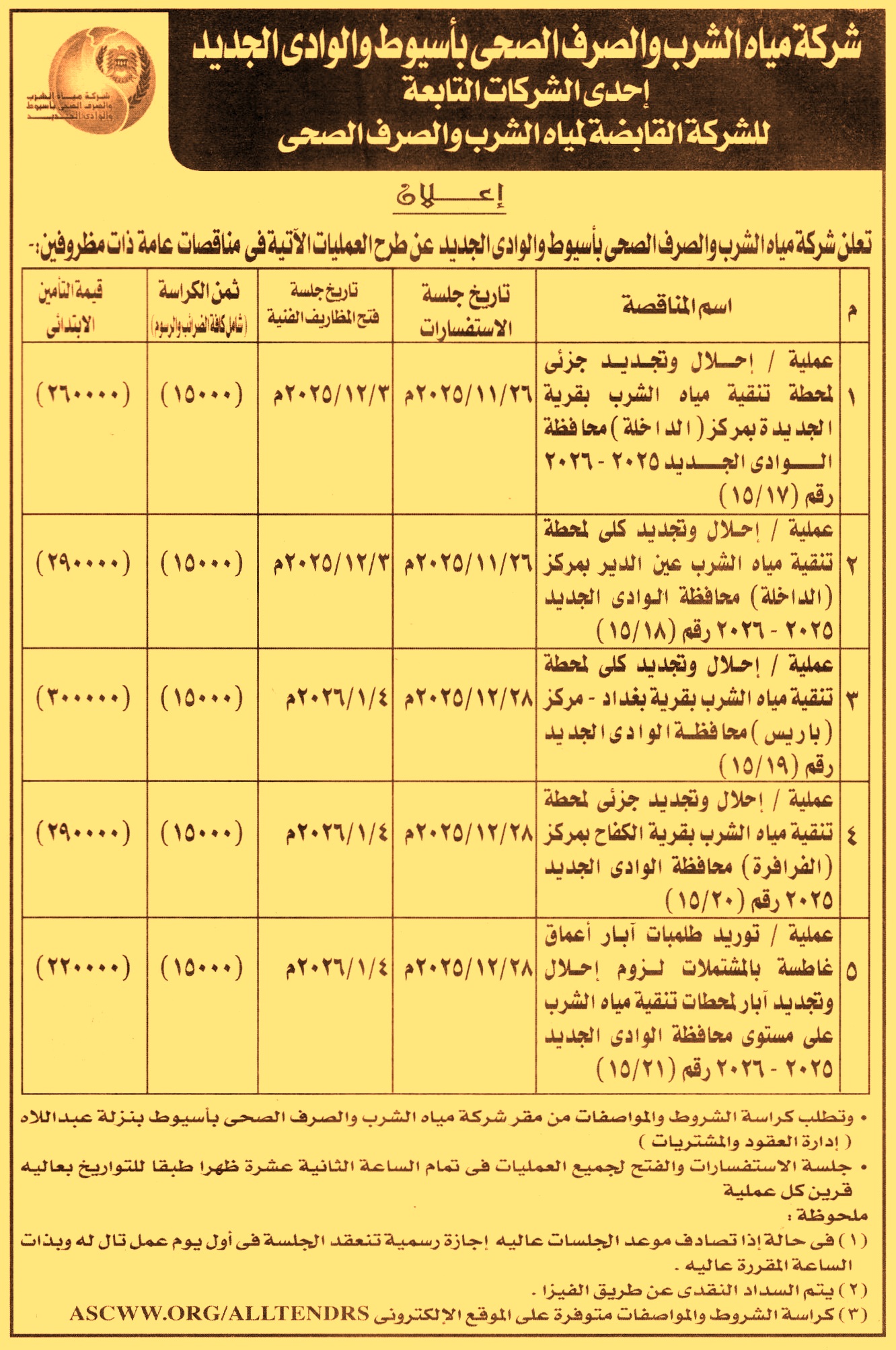 HOT Information مزايدة عامة رقم 17/15 لعملية إحلال وتجديد جزئي لمحطة تنقية مياه الشرب بقرية الجديدة بمركز الداخلة بمحافظة الوادي الجديد (جلسة الاستفسارات يوم 26/11/2025) عن جريدة الأهرام Post navigation محافظة أسيوط الشركة الوطنية لخدمات الملاحة الجوية