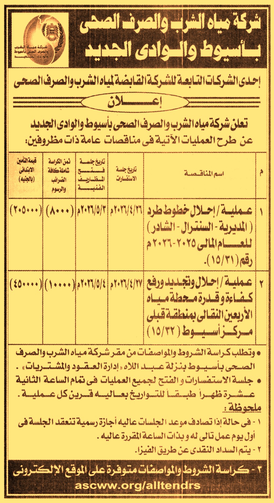 HOT information مزايدة عامة رقم 30/15 لعملية إحلال خطوط طرد “المديرية, السنترال, الشادر” (جلسة الاستفسارات يوم 26/4/2026) عن جريدة الجمهورية Post navigation الجمعية التعاونية للبناء والإسكان لمستشاري هيئة قضايا الدولة بمدينة المنصورة جمعية الإسراء لتنمية المجتمع بأسيوط