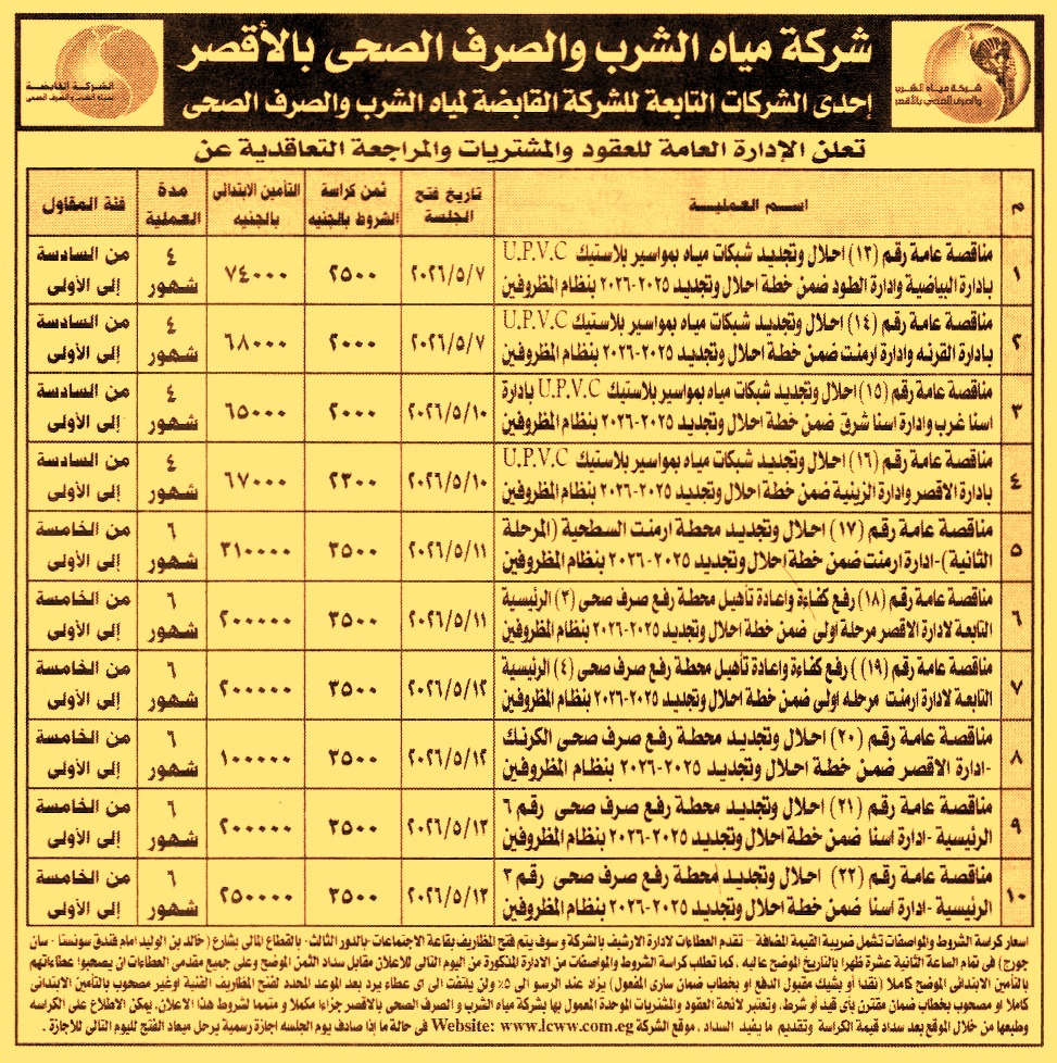 HOT Information مناقصة عامة رقم 13/2025/2026 لعملية إحلال وتجديد شبكات مياه بمواسير بلاستيك U.P.V.C بإدارة البياضية وإدارة الطود مدة العملية 4 أشهر (فئة التصنيف من السادسة إلى الأولى) عن جريدة الأخبار Post navigation الإدارة العامة لصرف بني سويف مؤسسة دار الهلال للطباعة والنشر