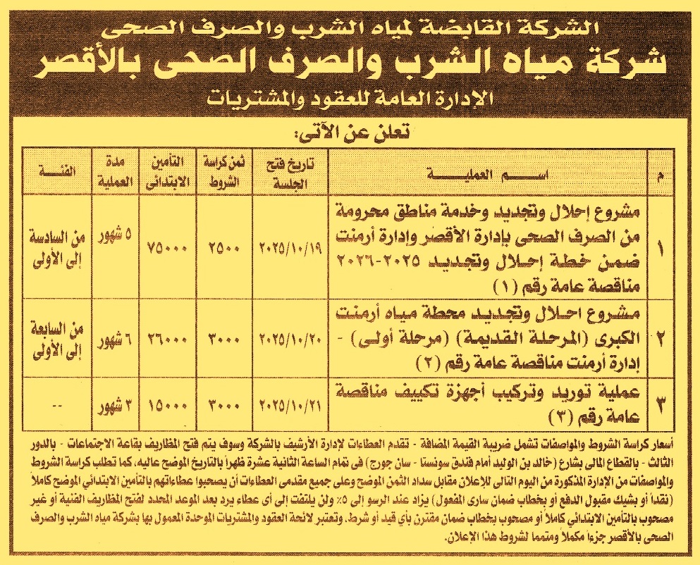 HOT information مناقصة عامة رقم 1/2025/2026 لعملية إحلال وتجديد وخدمة مناطق محرومة من الصرف الصحي بإدارة الأقصر وإدارة أرمنت مدة العملية 5 أشهر (فئة التصنيف من السادسة إلى الأولى) عن جريدة الأخبار Post navigation مركز شباب التنمية الشبابية بفوة محافظة قنا