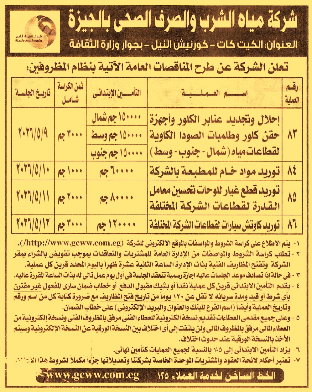 HOT information مناقصة عامة رقم 83/2025/2026 لعملية إحلال وتجديد عنابر الكلور وأجهزة حقن الكلور وطلمبات الصودا الكاوية لقطاعات مياه “شمال, جنوب, وسط” (مدة سريان خطاب الضمان 4 أشهر) عن جريدة الأخبار Post navigation وزارة الصناعة الشركة المصرية للأتوبيس الترددي
