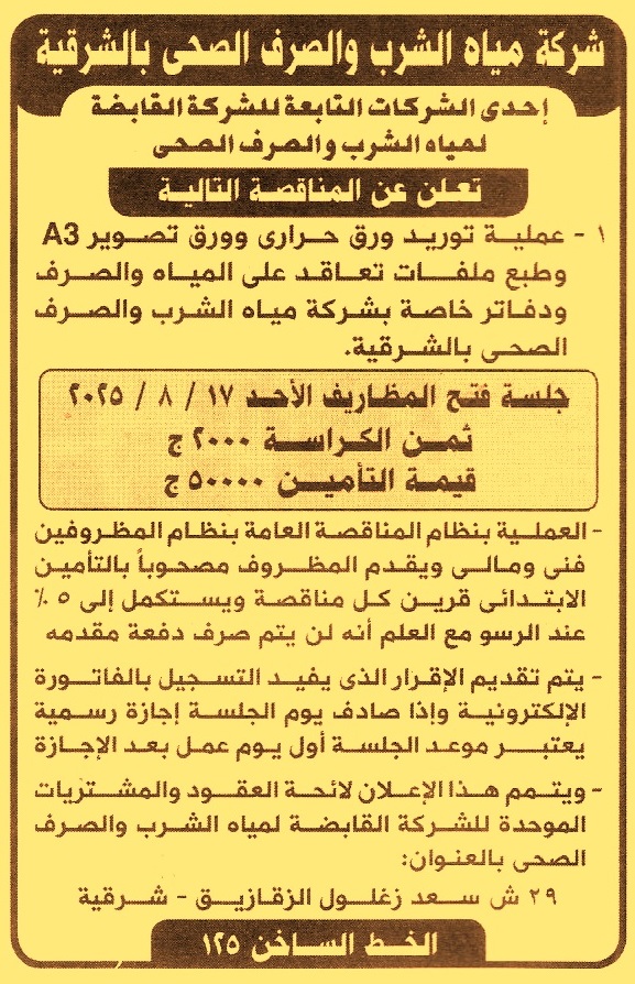 HOT Information مناقصة عامة لعملية توريد ورق حراري وورق تصوير A3 وطبع ملفات تعاقد على المياه والصرف ودفاتر خاصة بالشركة عن جريدة الأهرام Post navigation الشركة القابضة لكهرباء مصر شركة مياه الشرب بالقاهرة الكبرى