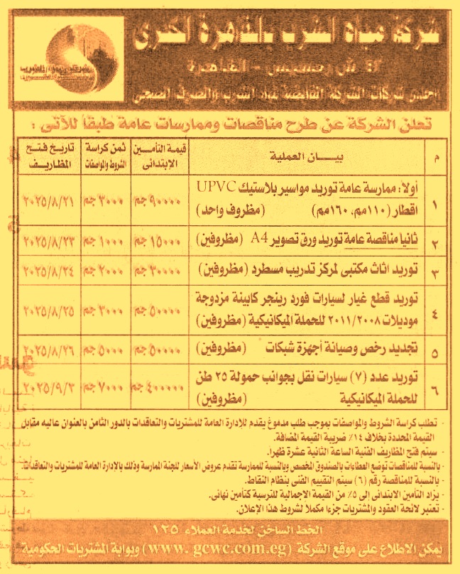 HOT Information ممارسة عامة لعملية توريد مواسير بلاستيك UPVC أقطار “110مم, 160مم” عن جريدة الأخبار Post navigation شركة مياه الشرب والصرف الصحي بالشرقية شركة مياه الشرب والصرف الصحي بالغربية
