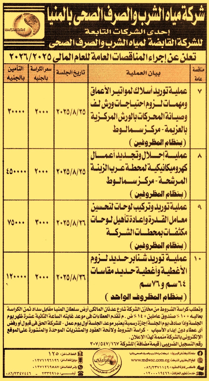 HOT information مناقصة عامة رقم 7/2025/2026 لعملية توريد أسلاك لمواتير الأعماق ومهمات لزوم احتياجات ورش لف وصيانة المحركات بالورش المركزية بالعزيمة – مركز سمالوط (للشركة الحق في قبول أو رفض أي عطاء بدون ابداء الأسباب) عن جريدة الجمهورية Post navigation مركز شباب أجهور الرمل الأزهر الشريف