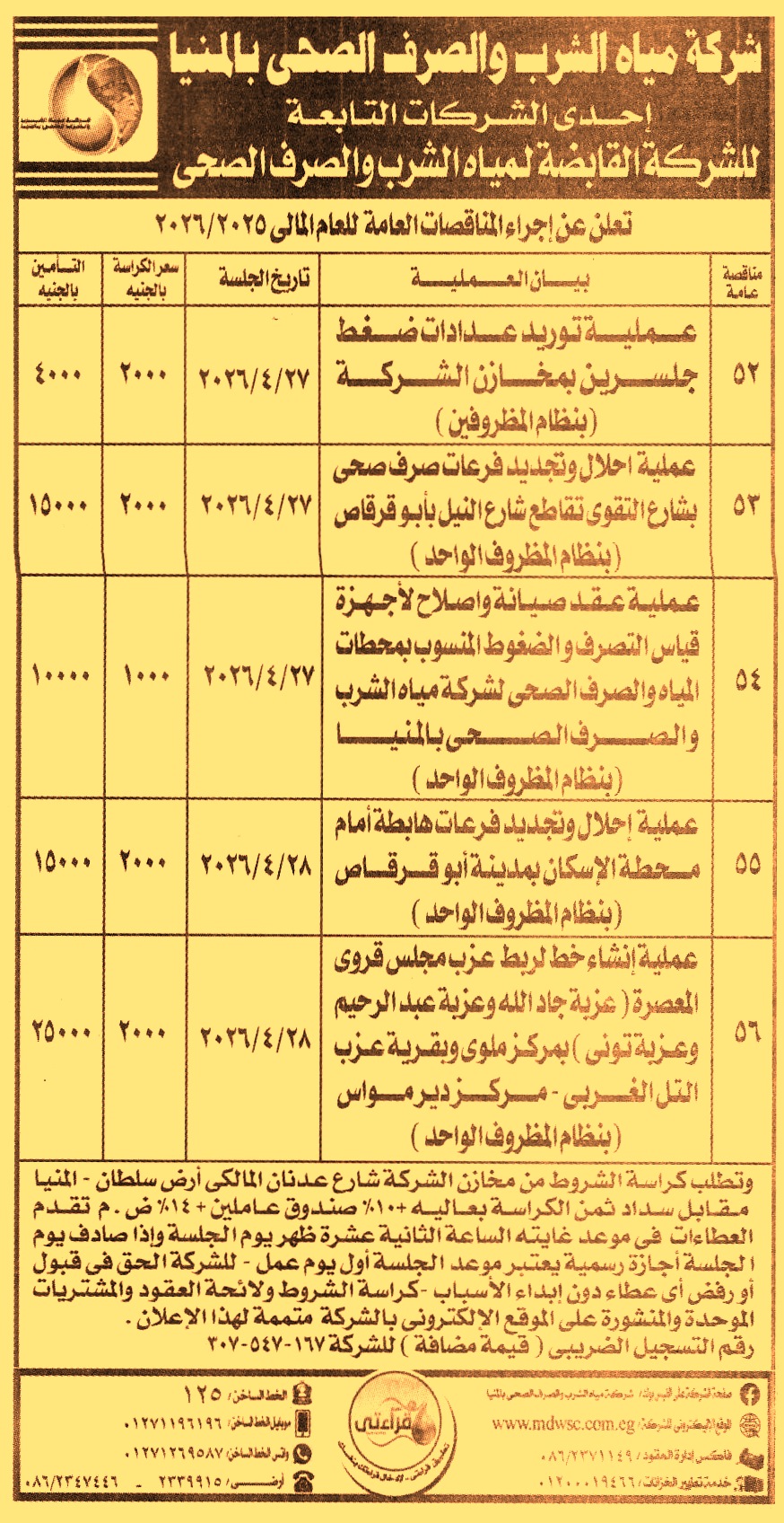 HOT Information مناقصة عامة رقم 52/2025/2026 لعملية توريد عدادات ضغط جلسرين بمخازن الشركة (للشركة الحق في قبول أو رفض أي عطاء بدون ابداء الأسباب) عن جريدة الجمهورية Post navigation وزارة الشباب والرياضة الجمعية المشتركة للإصلاح الزراعي بدكرنس