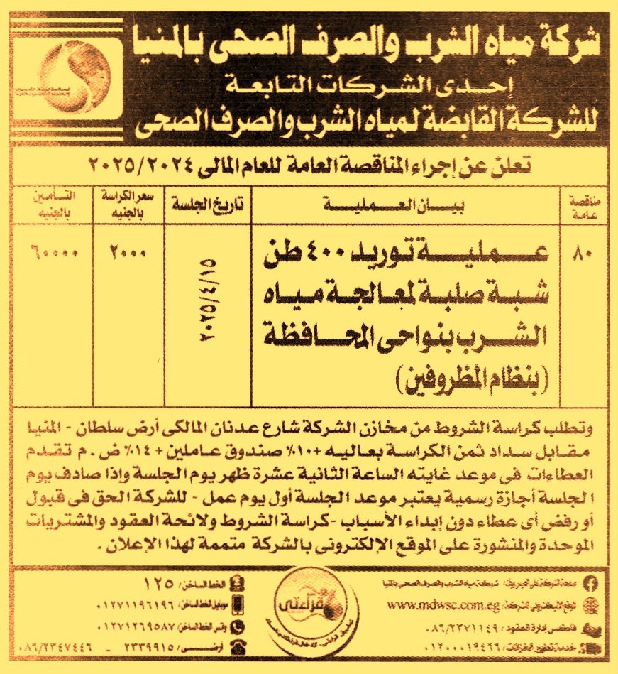 HOT Information مناقصة عامة رقم 80/2024/2025 لعملية توريد 400 طن شبة صلبة لمعالجة مياه الشرب بنواحي المحافظة (للشركة الحق في قبول أو رفض أي عطاء بدون ابداء الأسباب) عن جريدة الجمهورية Post navigation الإدارة العامة لصرف القليوبية جامعة دمنهور