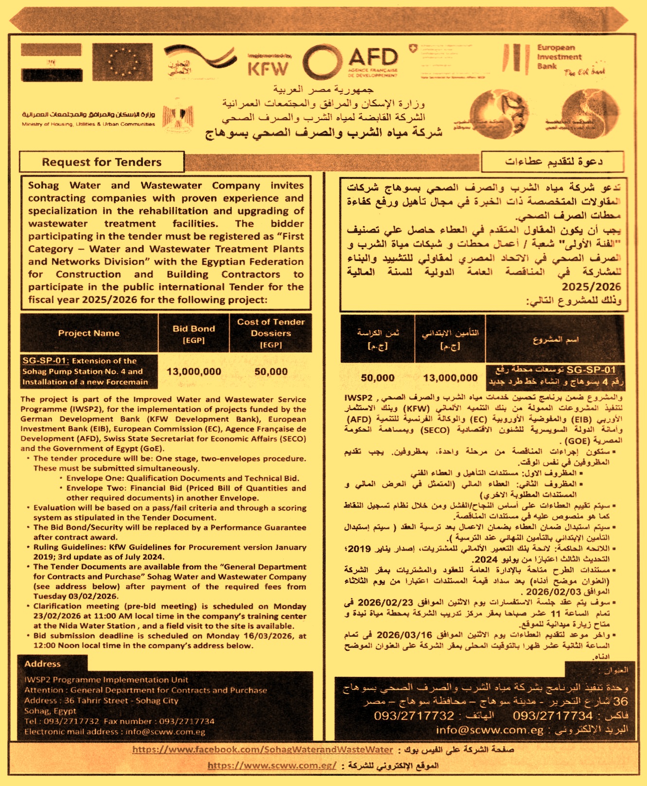 لتنفيذ المشروعات الممولة من بنك التنمية الألماني وبنك الاستثمار الأوروبي والمفوضية الأوروبية والوكالة الفرنسية للتنمية وأمانة الدولة السويسرية للشئون الاقتصادية وبمساهمة الحكومة المصرية