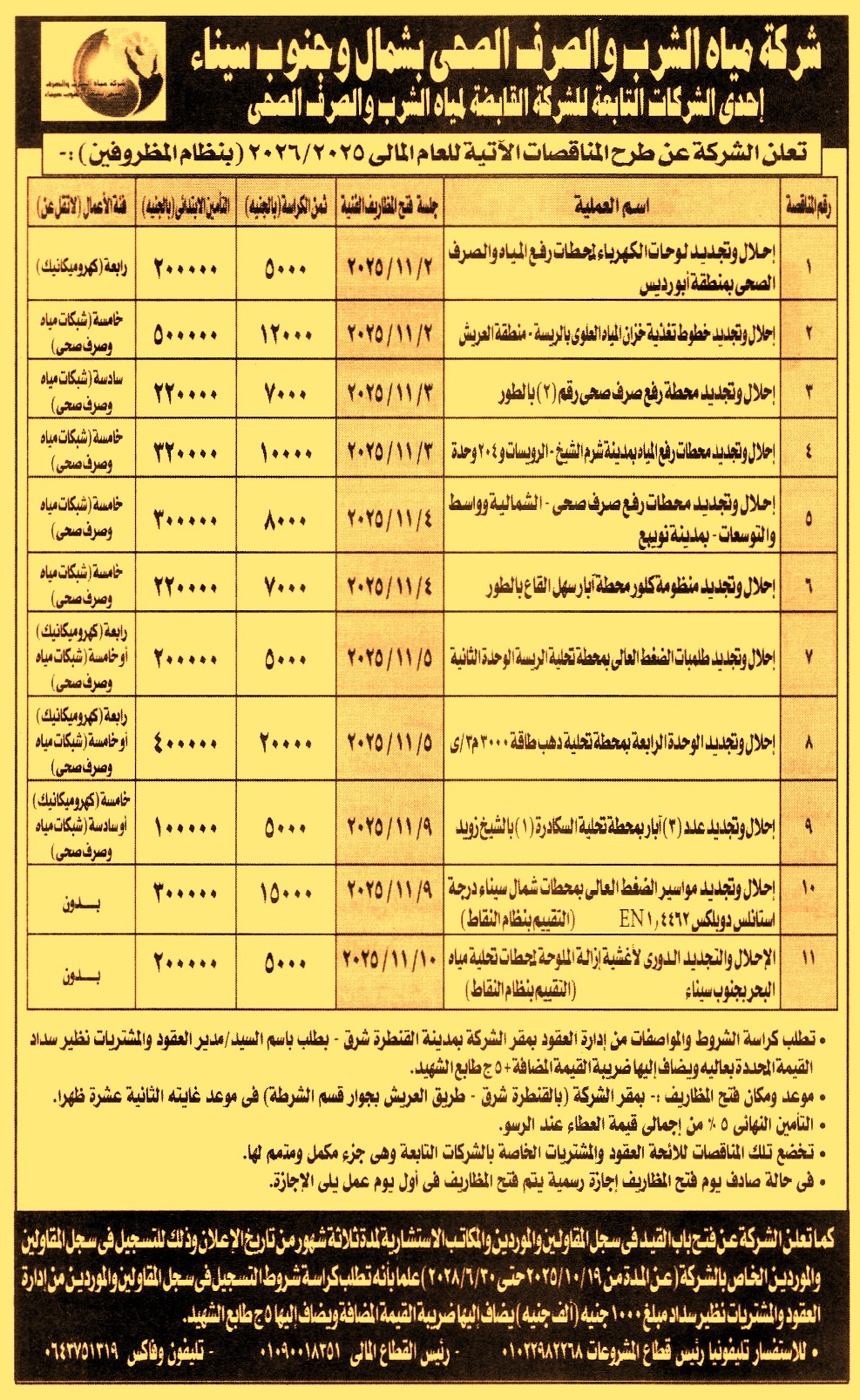 HOT Information مناقصة عامة لعملية إحلال وتجديد لوحات الكهرباء لمحطات رفع المياه والصرف الصحي بمنطقة أبو رديس (فئة التصنيف الرابعة شعبة أعمال كهروميكانيكية) عن جريدة الأهرام Post navigation الهيئة العامة لميناء الإسكندرية شركة نجع حمادي للفيبر بورد