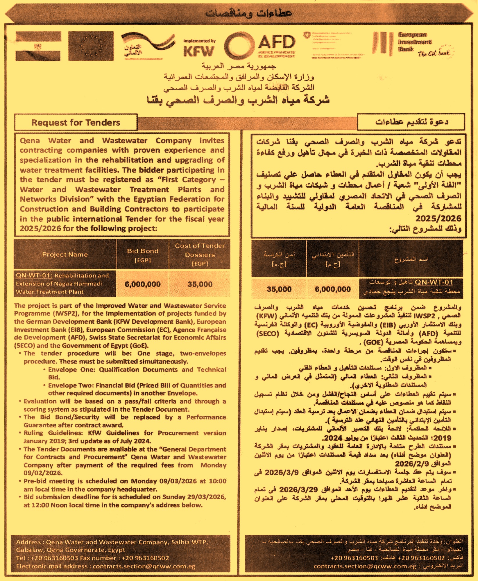 لتنفيذ المشروعات الممولة من بنك التنمية الألماني وبنك الاستثمار الأوروبي والمفوضية الأوروبية والوكالة الفرنسية للتنمية وأمانة الدولة السويسرية للشئون الاقتصادية وبمساهمة الحكومة المصرية