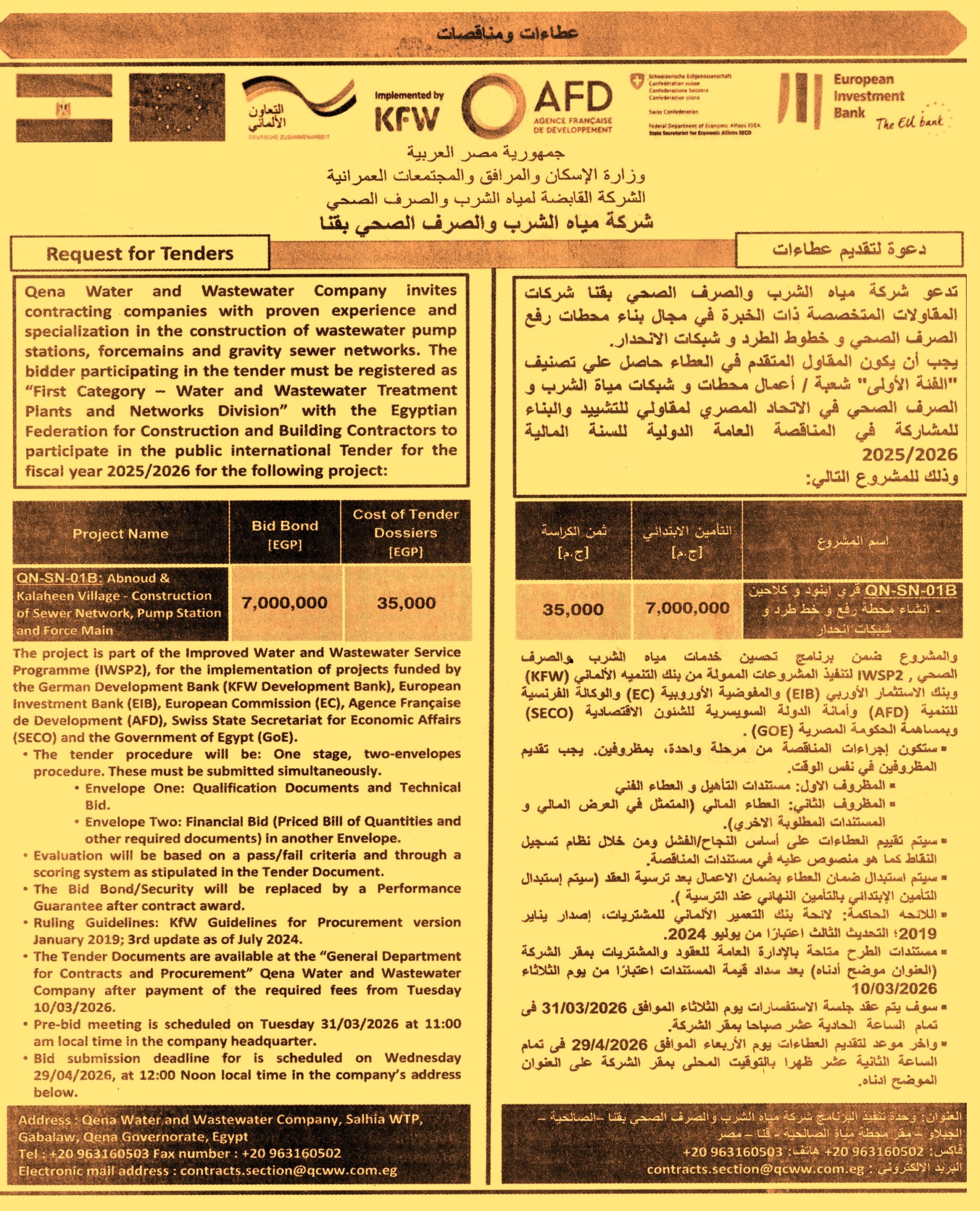 لتنفيذ المشروعات الممولة من بنك التنمية الألماني وبنك الاستثمار الأوروبي والمفوضية الأوروبية والوكالة الفرنسية للتنمية وأمانة الدولة السويسرية للشئون الاقتصادية وبمساهمة الحكومة المصرية