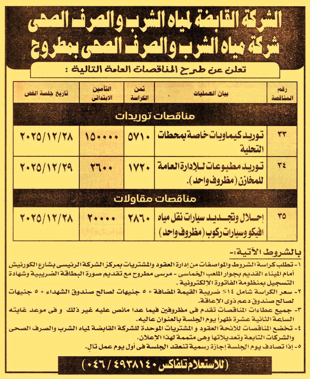 HOT information مناقصة عامة رقم 33 لعملية توريد كيماويات خاصة بمحطات التحلية عن جريدة الأهرام Post navigation شركة مياه الشرب والصرف الصحي بأسيوط والوادي الجديد وزارة الثقافة