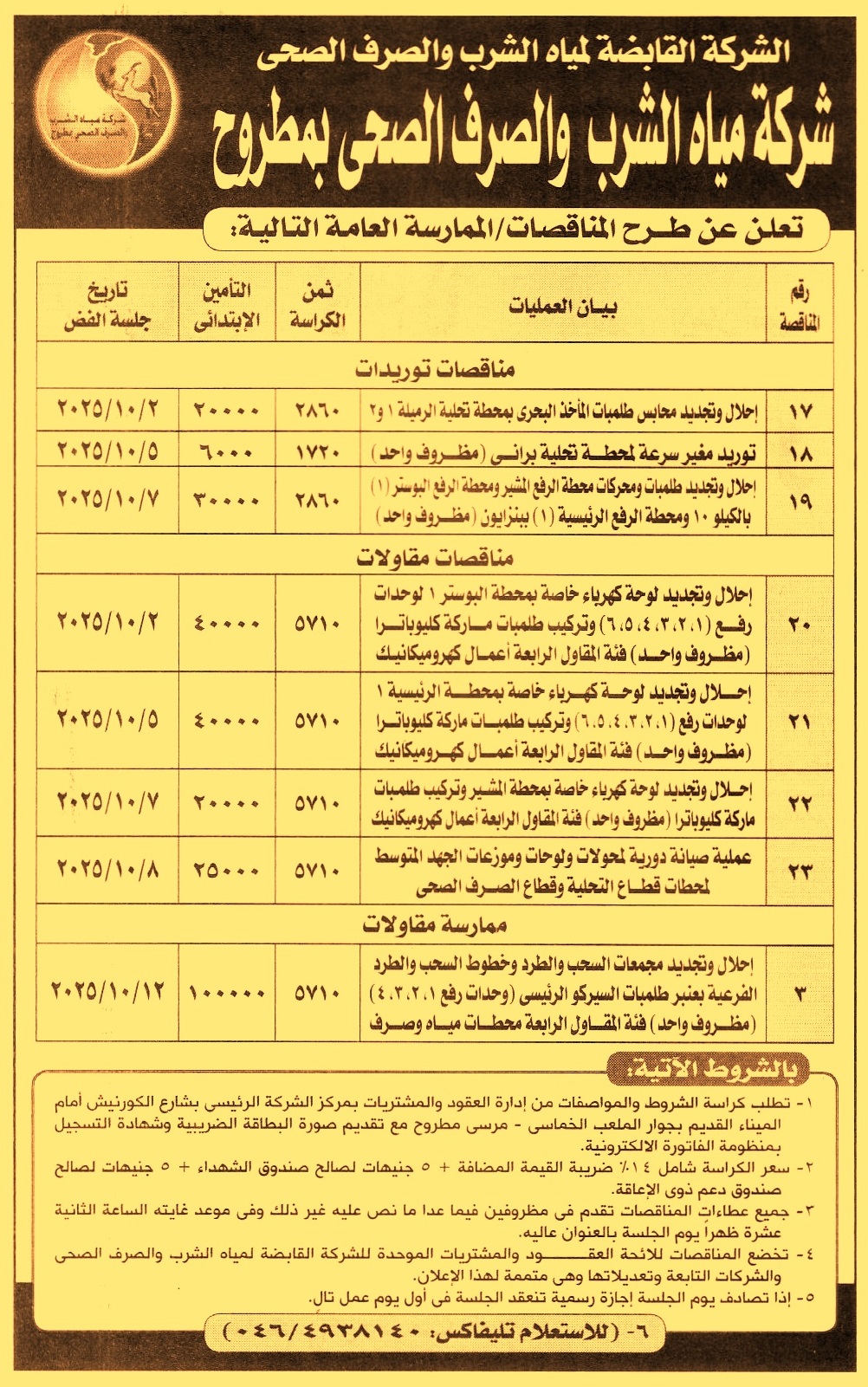 HOT Information مناقصة عامة رقم 17 لعملية إحلال وتجديد محابس طلمبات المأخذ البحري بمحطة تحلية الرميلة 1 و2 عن جريدة الأخبار Post navigation جهاز تنمية مدينة سوهاج الجديدة حي منشأة ناصر