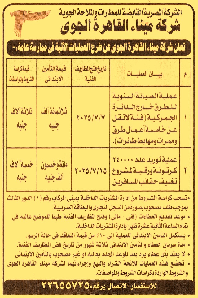 HOT Information ممارسة عامة لعملية تنفيذ أعمال الصيانة السنوية للطرق خارج الدائرة الجمركية (فئة التصنيف الخامسة شعبة أعمال طرق وممرات ومهابط الطائرات ومدة سريان العطاءات والتأمين الإبتدائي 3 أشهر) عن جريدة الأهرام Post navigation وزارة الشباب والرياضة جامعة القاهرة