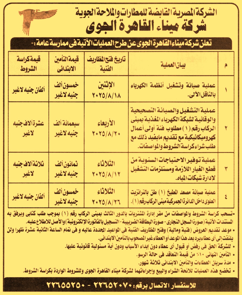 HOT Information ممارسة عامة لعملية صيانة وتشغيل أنظمة الكهرباء بالناقل الألي (مدة سريان العطاءات والتأمين الإبتدائي 3 أشهر ويرفق مع المستندات الأصل للإطلاع عليه وللشركة الحق في قبول او رفض أي عطاء بدون إبداء الأسباب) عن جريدة الأهرام Post navigation محافظة المنوفية الشركة المصرية للمطارات