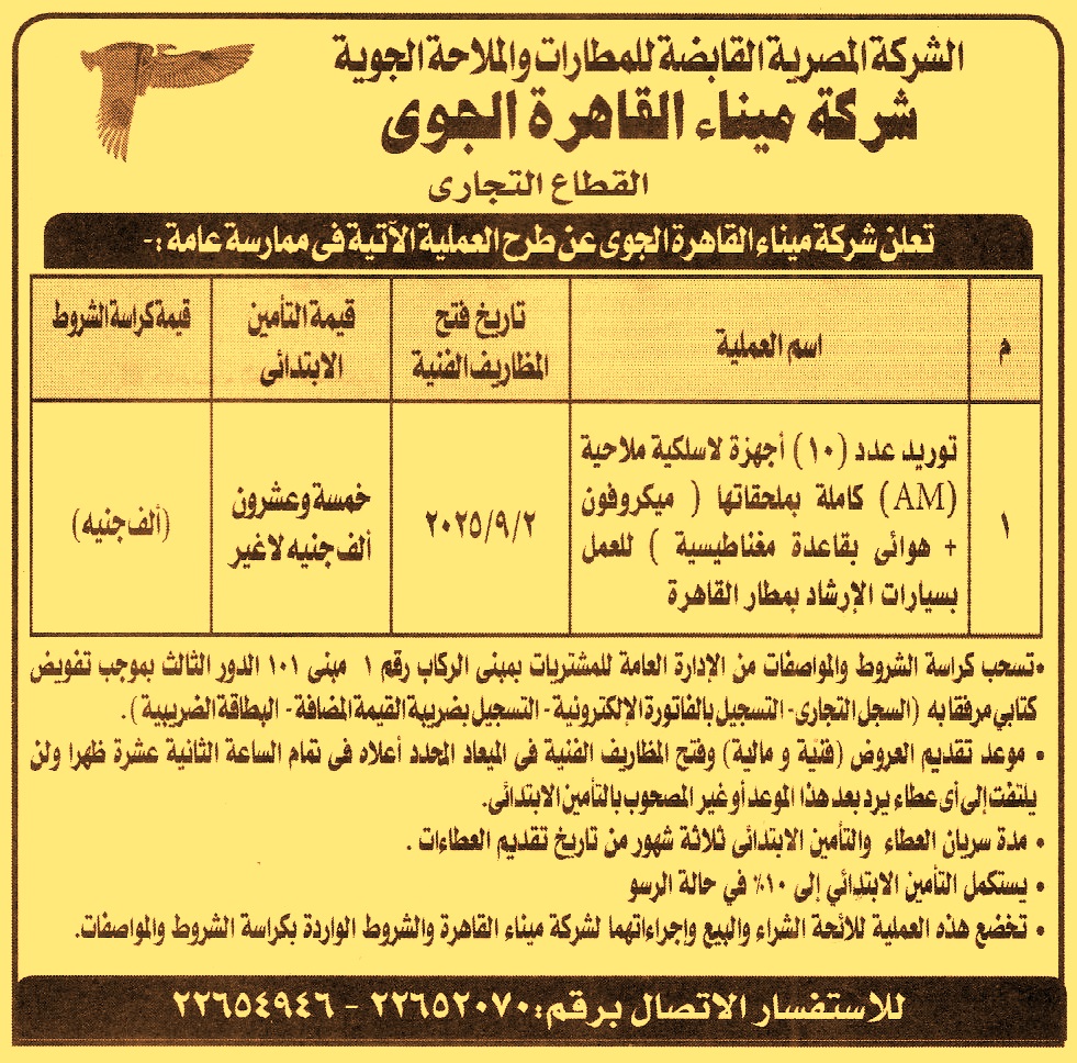 HOT Information ممارسة عامة لعملية توريد عدد 10 أجهزة لاسلكية ملاحية “AM” كاملة بملحقاتها “ميكروفون + هوائي بقاعدة مغناطيسية” للعمل بسيارات الإرشاد بمطار القاهرة (مدة سريان العطاءات والتأمين الإبتدائي 3 أشهر) عن جريدة الأهرام Post navigation جهاز تنمية مدينة العاشر من رمضان شركة مياه الشرب والصرف الصحي بالبحيرة