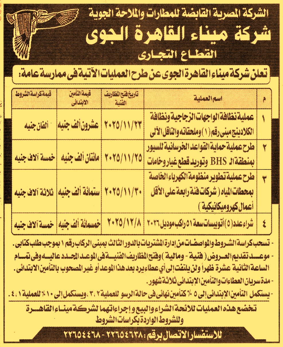 HOT Information ممارسة عامة لعملية تنفيذ أعمال نظافة الواجهات الزجاجية ونظافة الكلادينج مبنى رقم 1 وملحقاته والناقل الألي (مدة سريان العطاءات والتأمين الإبتدائي 3 أشهر) عن جريدة الجمهورية Post navigation معهد بحوث المحاصيل الحقلية جامعة طنطا