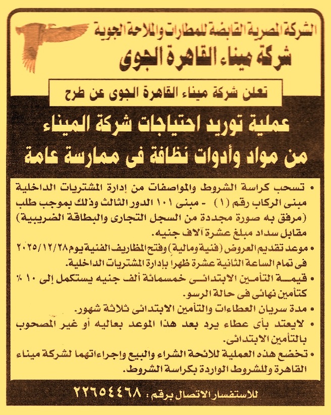 HOT Information ممارسة عامة لعملية توريد مواد وأدوات نظافة (مدة سريان العطاءات والتأمين الإبتدائي 3 أشهر) عن جريدة الأهرام Post navigation الشركة المصرية للمطارات مركز شباب الخارجة للتنمية الشبابية