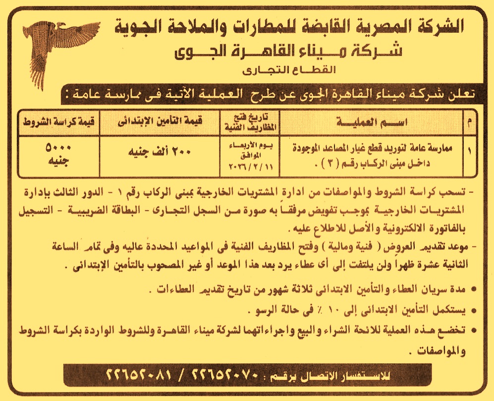 HOT Information ممارسة عامة لعملية توريد قطع غيار المصاعد الموجودة داخل مبنى الركاب رقم 3 (مدة سريان العطاءات والتأمين الإبتدائي 3 أشهر) عن جريدة الأهرام Post navigation الشركة المصرية للمطارات رئاسة حي عابدين