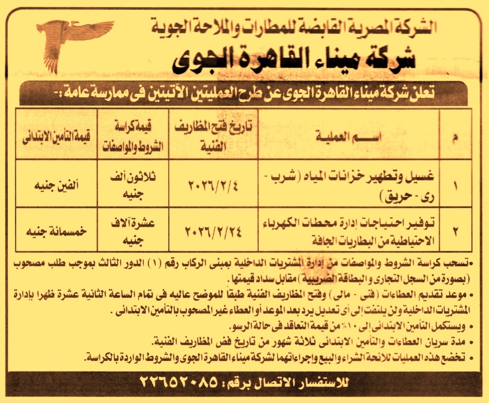 HOT Information ممارسة عامة لعملية غسيل وتطهير خزانات المياه “شرب, ري, حريق” (مدة سريان العطاءات والتأمين الإبتدائي 3 أشهر) عن جريدة الأهرام Post navigation مديرية المساحة بالفيوم مركز تحديث الصناعة