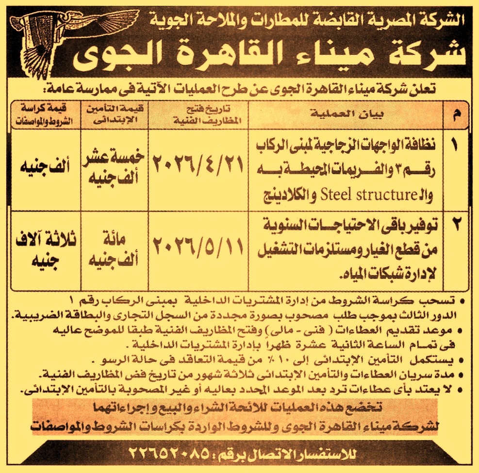 HOT Information ممارسة عامة لعملية نظافة الواجهات الزجاجية لمبنى الركاب رقم 3 والفريمات المحيطة به والـ Steel Structure والكلادينج (مدة سريان العطاءات والتأمين الإبتدائي 3 أشهر) عن جريدة الجمهورية Post navigation وزارة السياحة والأثار مركز شباب بشتيل