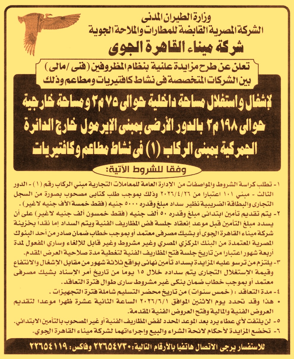 بمبنى الإيرمول خارج الدائرة الجمركية بمبنى الركاب “1” في نشاط مطاعم وكافتيريات