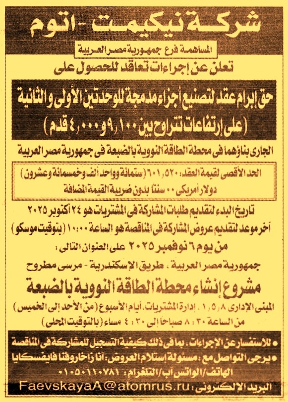 (أخر موعد لتقديم العروض يوم 6/11/2025 الساعة 10 ص بتوقيت موسكو)