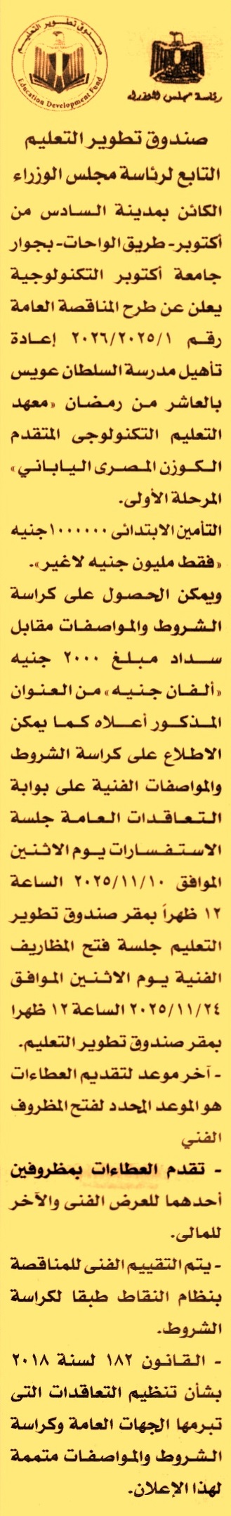 مناقصة عامة رقم 1/2025/2026 لعملية