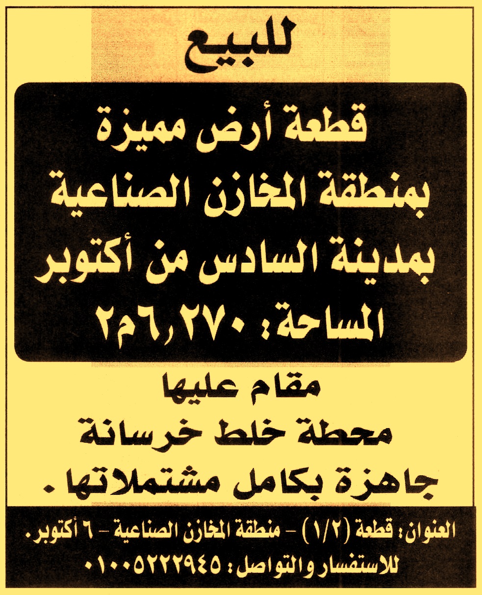 HOT Information للبيع قطعة أرض بمساحة 6270م2 بمنطقة المخازن الصناعية – مدينة السادس من أكتوبر مقام عليها محطة خلط خرسانة مركزية جاهزة بكامل مشتملاتها العنوان: القطعة 1/2 منطقة المخازن – 6 أكتوبر ت: 01005222945 عن جريدة الأهرام Post navigation GIZ Cairo Office محافظة مطروح