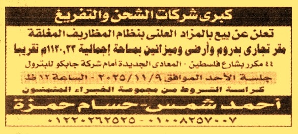 HOT Information مزايدة علنية لعملية بيع بدروم وأرضي وميزانين مقر تجاري بمساحة إجمالي 1120.33م تقريبا 44 مكرر بشارع فلسطين – المعادي الجديدة – محافظة القاهرة أمام شركة جابكو للبترول عن جريدة الجمهورية Post navigation المجموعة الاستشارية المتكاملة شركة مضارب الشرقية
