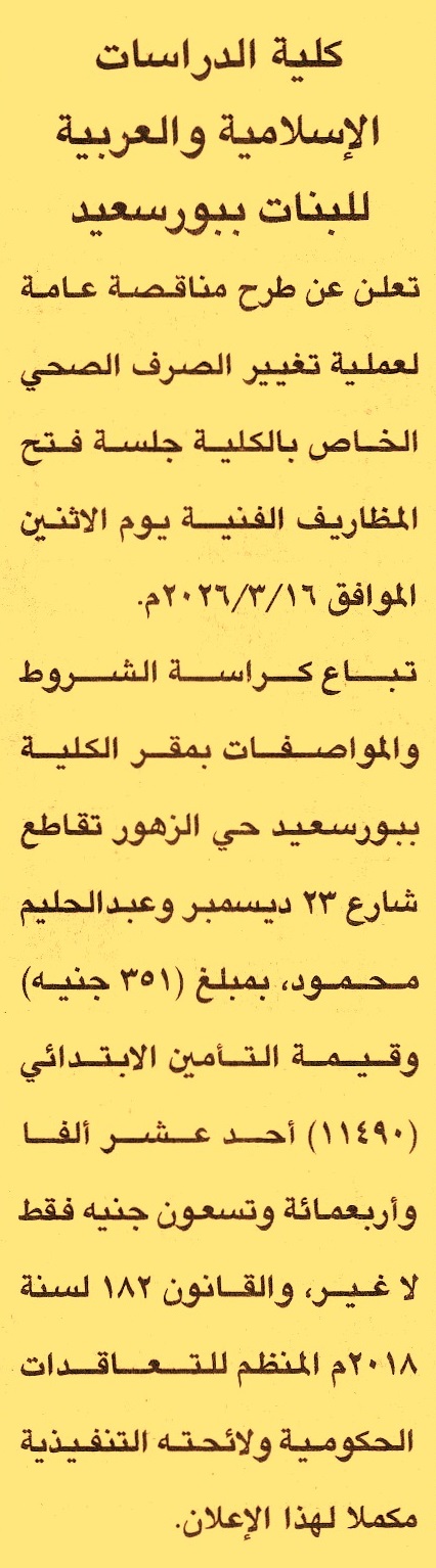 HOT Information مناقصة عامة لعملية تغيير الصرف الصحي الخاص بالكلية عن جريدة الجمهورية Post navigation مركز شباب مدينة قنا نادي الألعاب الرياضية بدمنهور