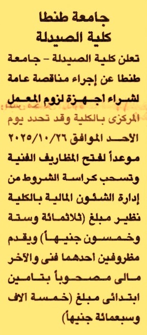 HOT Information مناقصة عامة لعملية توريد أجهزة لزوم المعمل المركزي بالكلية عن جريدة الجمهورية Post navigation رئاسة حي ثالث بمحافظة الإسماعيلية معهد بحوث الصحة الحيوانية