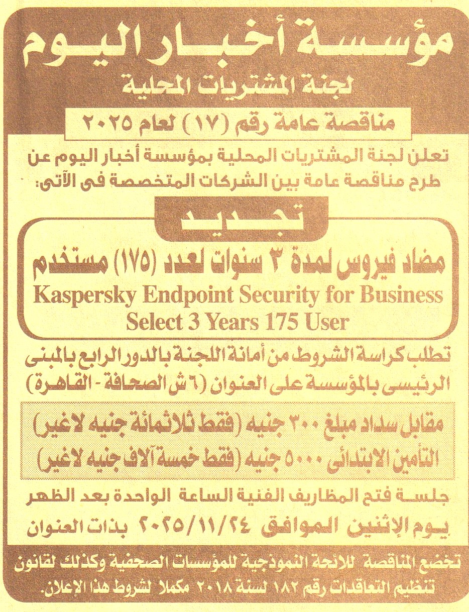 HOT information مناقصة عامة رقم 17 لعام 2025 لعملية تجديد مضاد فيروس لمدة 3 سنوات لعدد 175 مستخدم Kaspersky endpoint security for business select 3 years 175 users عن جريدة الأخبار Post navigation الشركة العامة للصوامع والتخزين مؤسسة أخبار اليوم