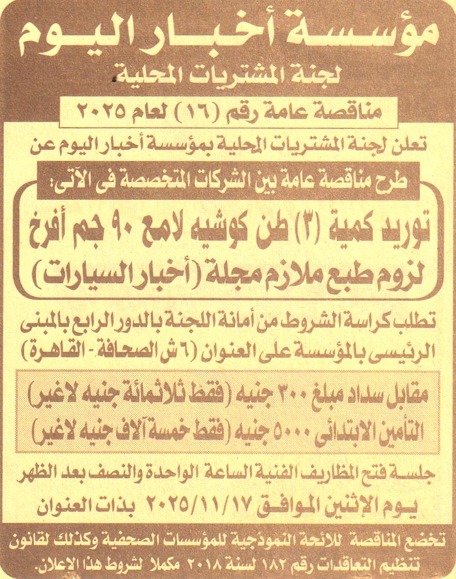 HOT information مناقصة عامة رقم 16/2025 لعملية توريد كمية 3 طن كوشيه لامع 90 جم أفرخ لزوم طبع ملازمة مجلة “أخبار السيارات” عن جريدة الأخبار Post navigation مؤسسة أخبار اليوم مؤسسة أخبار اليوم