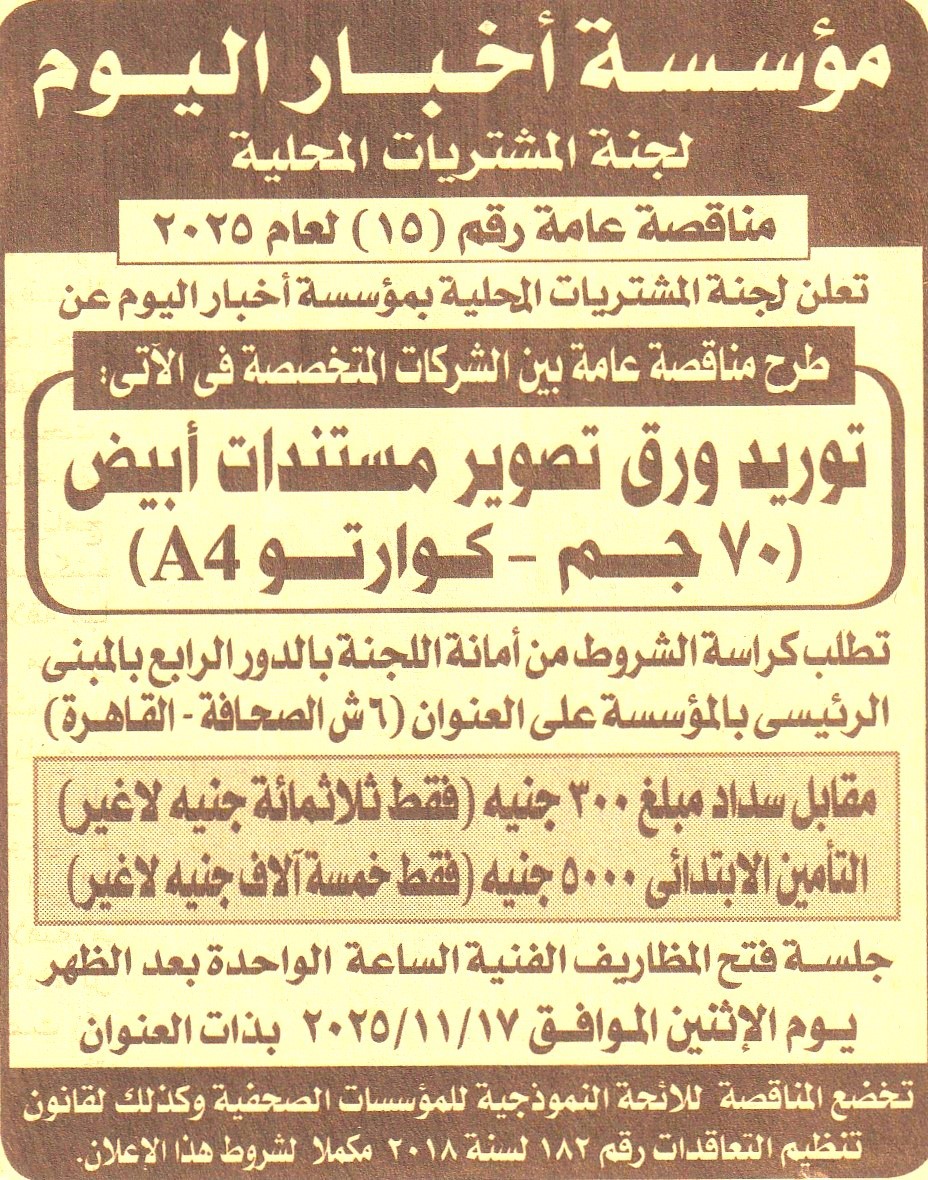 HOT information مناقصة عامة رقم 15/2025 لعملية توريد ورق تصوير مستندات أبيض (70 جرام – كوارتو A4) عن جريدة الأخبار Post navigation مؤسسة أخبار اليوم شركة مصر للبترول