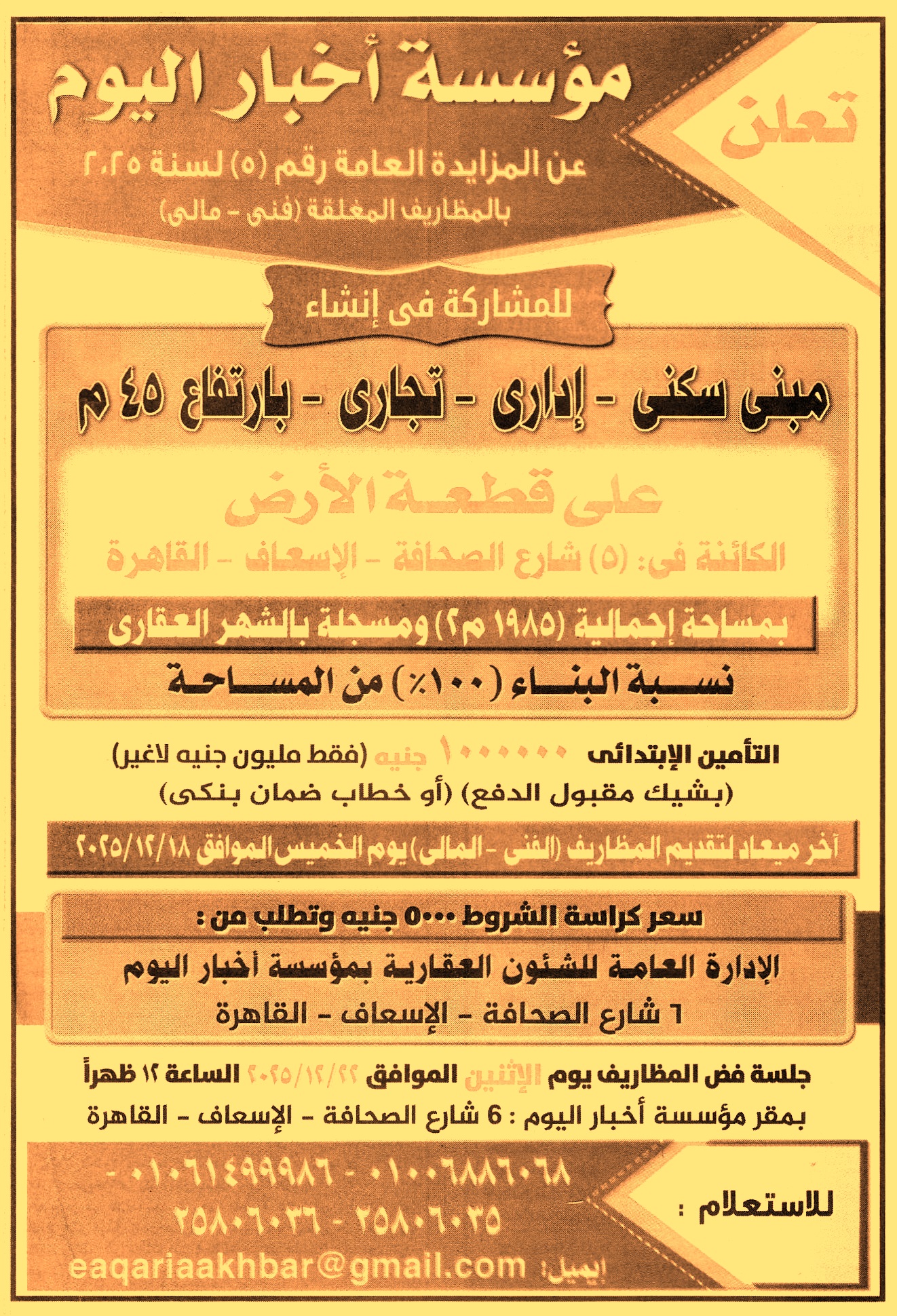 على قطعة الأرض الكائنة في 5 شارع الصحافة – الإسعاف – القاهرة