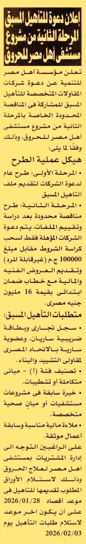 على أن يكون اخر موعد لاستلام طلبات التأهيل يوم 2026/2/3