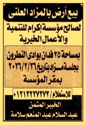 HOT Information مزايدة علنية لعملية بيع أرض بمساحة 25 فدان بوادي النطرون عن جريدة الجمهورية Post navigation نادي بدر الرياضي بالبحيرة لجهاز التنفيذي لمشروعات تحسين الأراضي