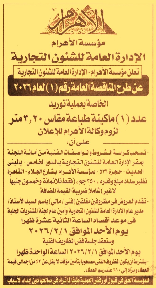 توريد عدد 1 ماكينة طباعة مقاس 3.20م