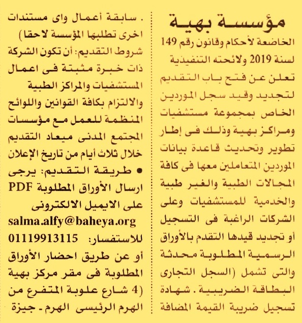 HOT Information فتح باب القيد وتجديد القيد بسجل الموردين في كافة المجالات الطبية والغير طبية والخدمية للمستشفيات (تقدم الأوراق المطلوبة PDF في خلال 3 أيام من تاريخ الإعلان على الإيميل) عن جريدة الأهرام Post navigation شركة مصر للبترول شركة الغازات البترولية