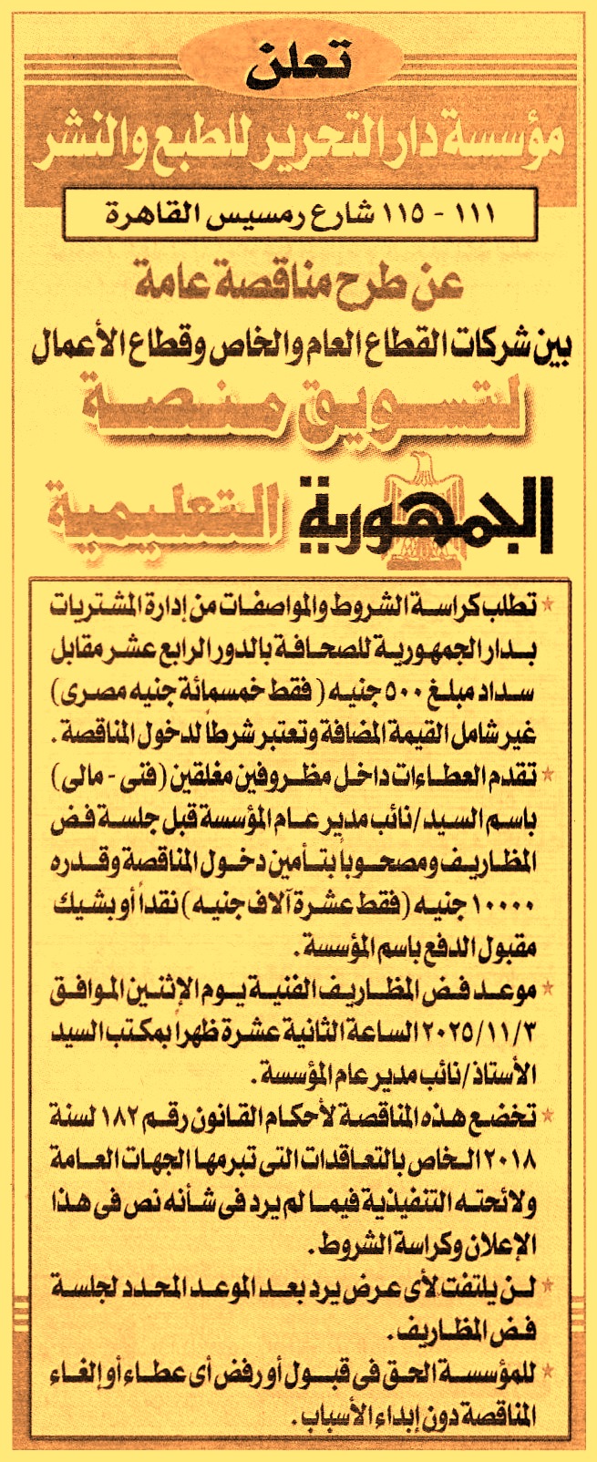 HOT Information مناقصة عامة لعملية تسويق منصة الجمهورية التعليمية (للمؤسسة الحق في قبول أو رفض أي عطاء أو إلغاء المناقصة دون إبداء الأسباب) عن جريدة الجمهورية Post navigation مكتبة الإسكندرية الشركة القابضة لمصر للطيران