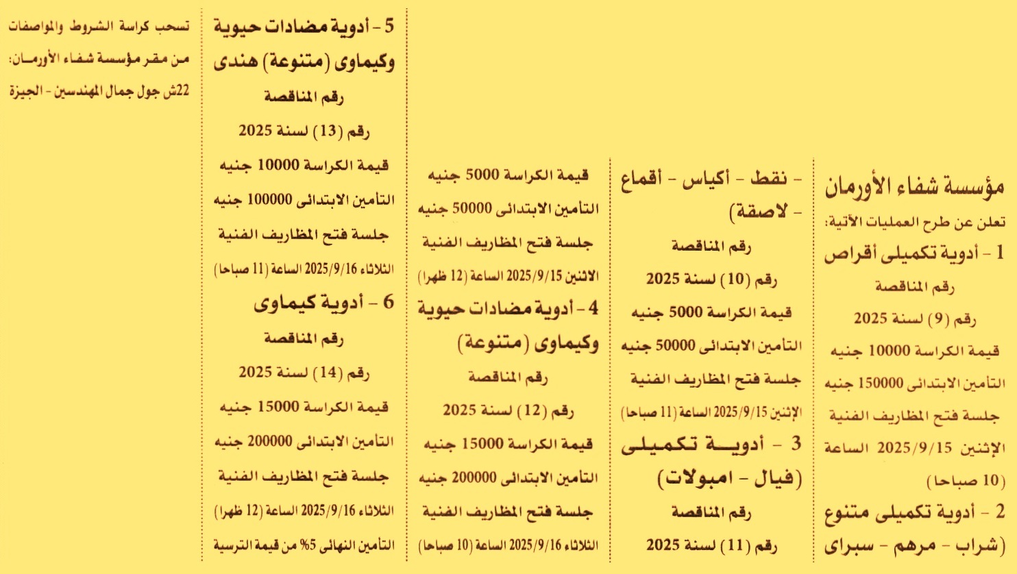 HOT Information ممارسة عامة رقم 9/2025 لعملية توريد أدوية تكميلي أقراص عن جريدة الأهرام Post navigation شركة مياه الشرب بالإسكندرية محافظة دمياط