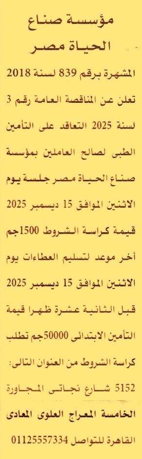 HOT Information مناقصة عامة رقم 3/2025 لعملية التعاقد على التأمين الطبي لصالح العاملين بالمؤسسة عن جريدة الأهرام Post navigation جمعية الخلفاء الراشدين مستشفى باب الشعرية الجامعي