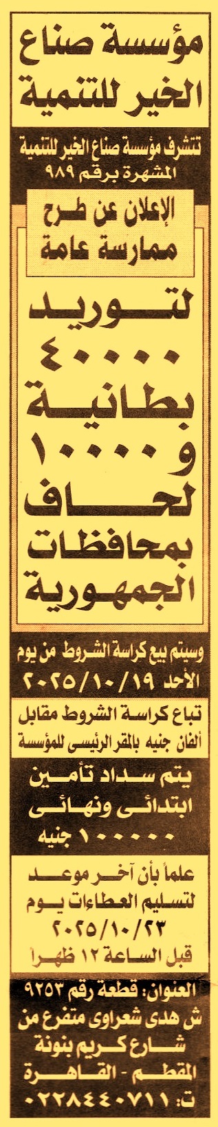 HOT information ممارسة عامة لعملية توريد 40 ألف بطانية و10 ألاف لحاف بمحافظات الجمهورية (تباع الكراسة إبتداء من يوم 19/10/2025) عن جريدة الأخبار Post navigation مركز التنمية الشبابية بمدينة بنها شركة التعاون للبترول